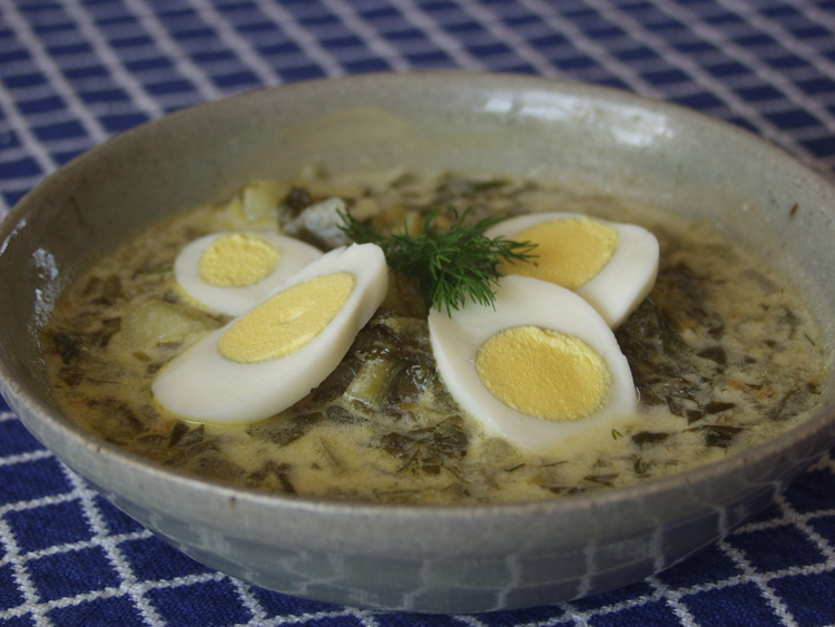 2. Bring the soup back up to barely a boil and add the sorrel, dill, and parsley. Cook just until the sorrel has wilted, about 5 minutes. Turn the heat back down to low and remove 1 cup of soup and pour it into a medium bowl. Set aside.