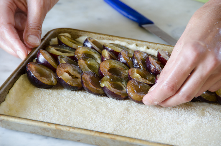 Sprinkling the dough with farina is a little trick used by German home bakers to absorb some of the juice that the plums release during baking.