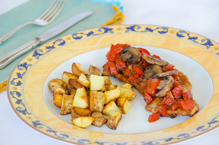 Zigeunerschnitzel1Zigeunerschnitzel (Gypsy Schnitzel) is usually not prepared by home cooks in Germany. The thin breaded schnitzel smothered with spicy pepper sauce and topped with mushrooms is something you would order at a restaurant. If you can find it on the menu under that name, that is.