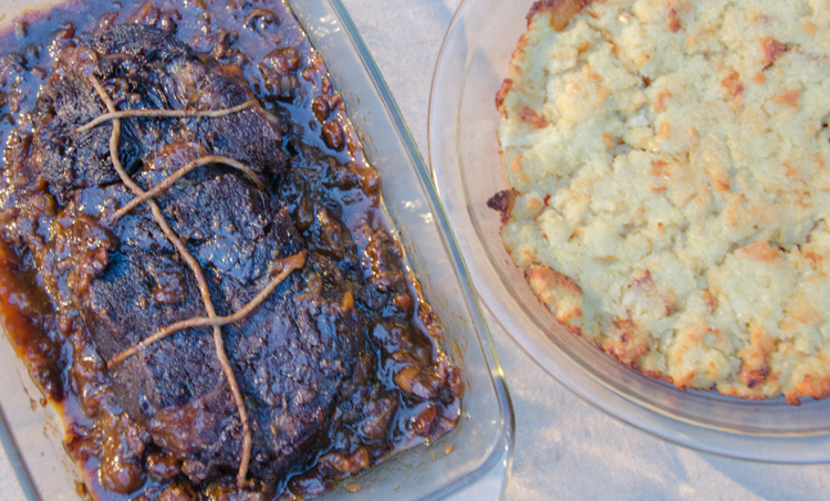 This sauerbraten is different from the standard German Sauerbraten in two ways: no cream is added to the sauce (so it’s kosher), and frankly, it does not need it because it is great as is; and secondly, white vinegar is used as opposed to the usual red wine vinegar and red vine. The result is a more subtle flavor, like a pot roast with a sweet- and sour gravy.