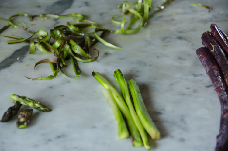 - Snap off the ends of the asparagus and set them aside. Cut off the heads and set aside. Peel the asparagus spears. An easy way to do this is to lie them down on your work surface. Chop the peeled spears into 2-inch (2.5 cm) pieces.