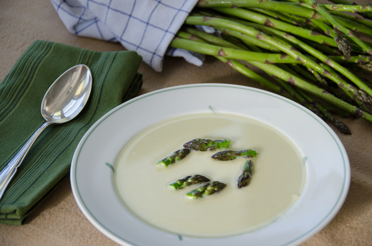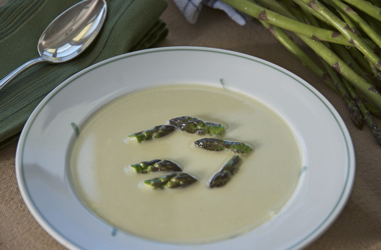 To create the special velvety texture of this soup, the asparagus should be very fresh. Older spears tend to be fibrous. Use only thick spears that can be peeled; if the spears are too thin, there will be nothing left after peeling.
