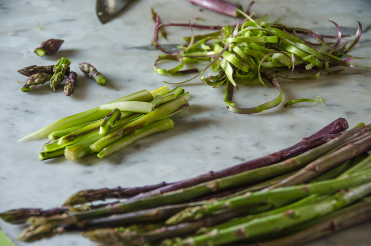 - Snap off the ends of the asparagus and set them aside. Cut off the heads and set aside. Peel the asparagus spears. An easy way to do this is to lie them down on your work surface. Chop the peeled spears into 2-inch (2.5 cm) pieces.