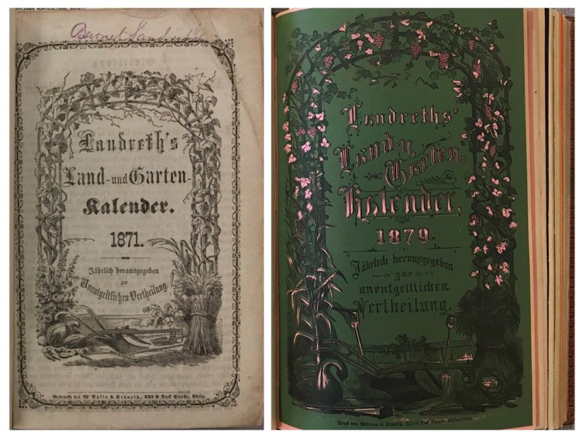 Landreth Co. 1871 and 1879 German-language seed almanachs and catalogs. Photos courtesy of Nursery Catalogs Collection. Pennsylvania Horticultural Society McLean Library.